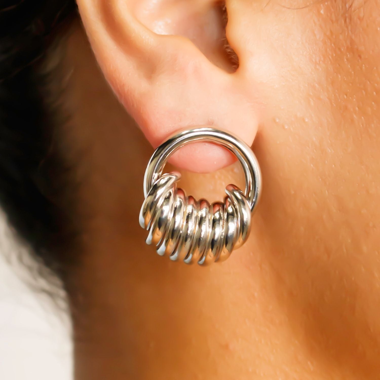 The Rhea Earrings bring a fresh, sculptural twist to a classic hoop. Designed with a smooth gold circle accented by stacked, high-shine rings, these silver hoop stud earrings create dimension and texture while keeping a clean, modern profile. Lightweight and polished, they add an instant touch of edge that works effortlessly from day to night.